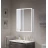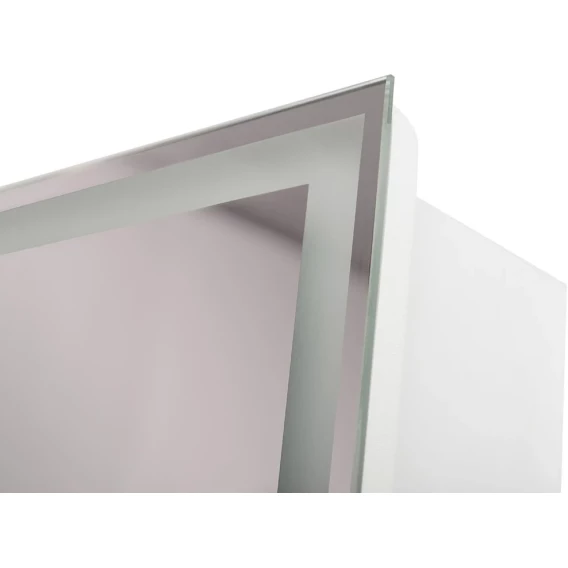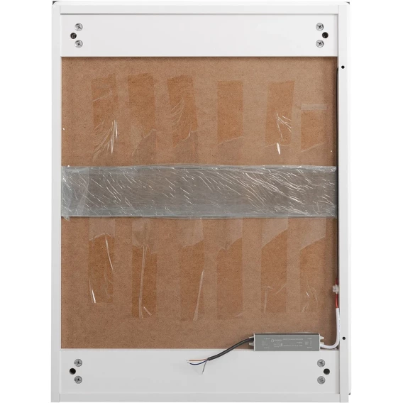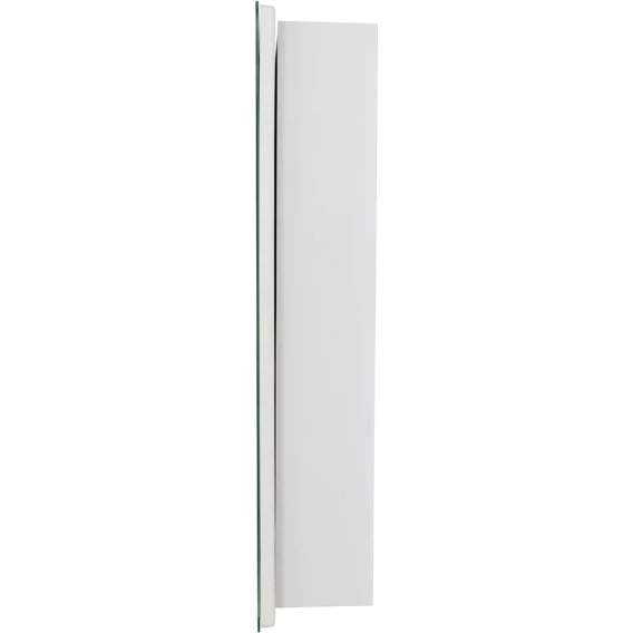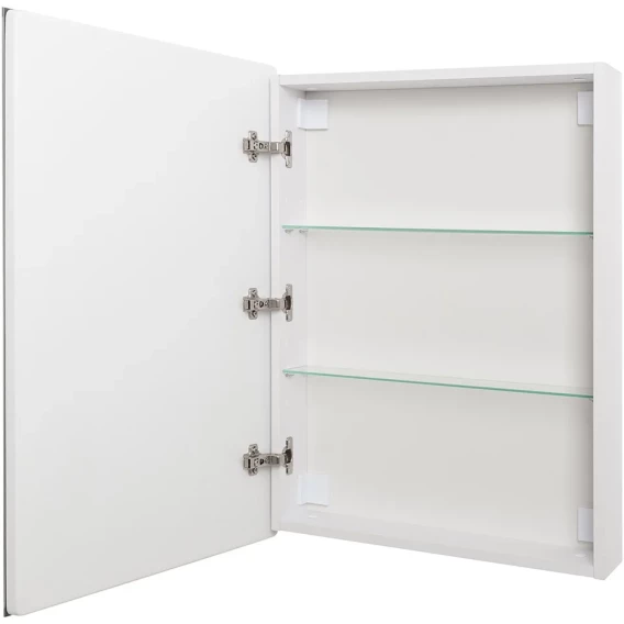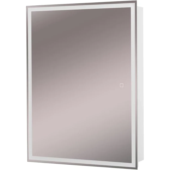 Зеркальный шкаф с одной распашной дверью, реверсный (правый или левый), со встроенной подсветкой и сенсорным выключателем. Петли с доводчиком. Лента закрыта коробом из светорассеивающего пластика, питание через петлю. Две стеклянные полки с возможностью регулировки высоты, полкодержатели с силиконовыми накладками. Корпус из ЛДСП белого цвета, лента SMD 3528 IP44, 12V, 6000 К, холодный свет.