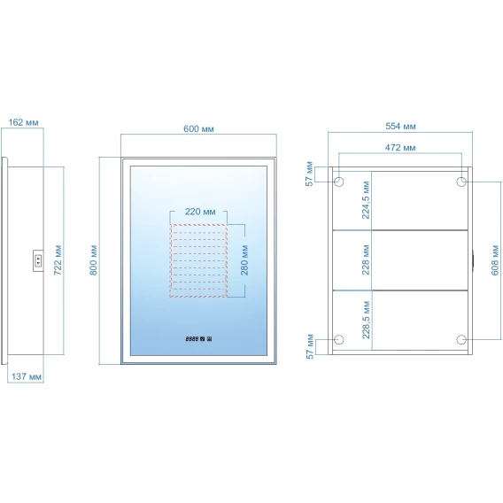 Механизм доводчика, Полочка, LED подсветка, Розетка, Сенсорный выключатель, Функция анти-пар, Электронные часы