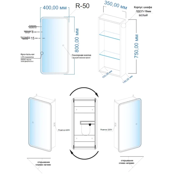 Полочка, LED подсветка, Сенсорный выключатель, Вилка