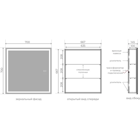 Крепление, Полочка, LED подсветка, Сенсорный выключатель, Функция анти-пар
