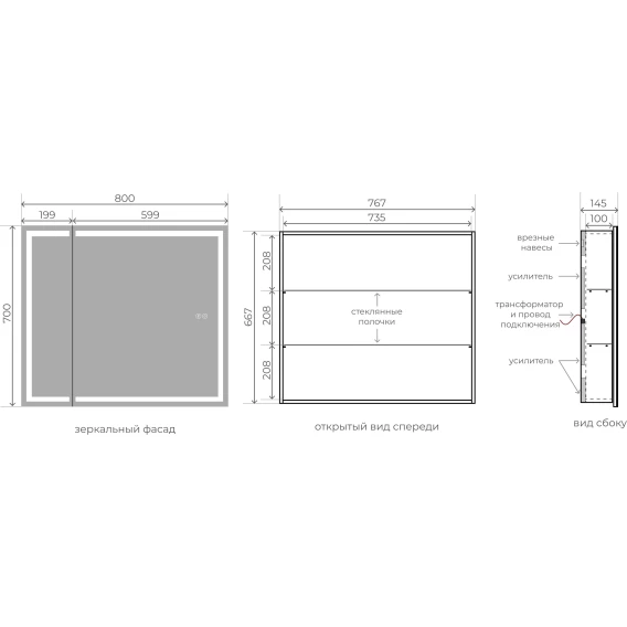 Крепление, Полочка, LED подсветка, Сенсорный выключатель, Функция анти-пар