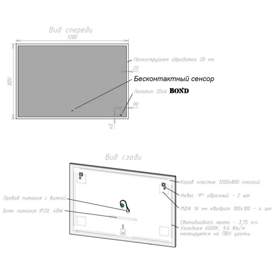 Крепление, LED подсветка, Сенсорный выключатель, Вилка