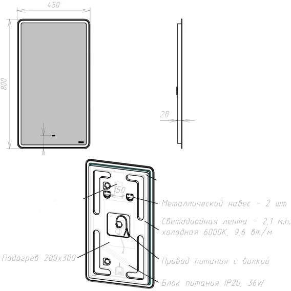 LED подсветка, Сенсорный выключатель, Функция анти-пар, Вилка