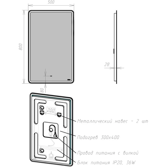 LED подсветка, Сенсорный выключатель, Функция анти-пар, Вилка