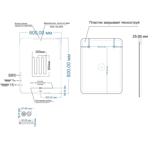 LED подсветка, Сенсорный выключатель, Функция анти-пар