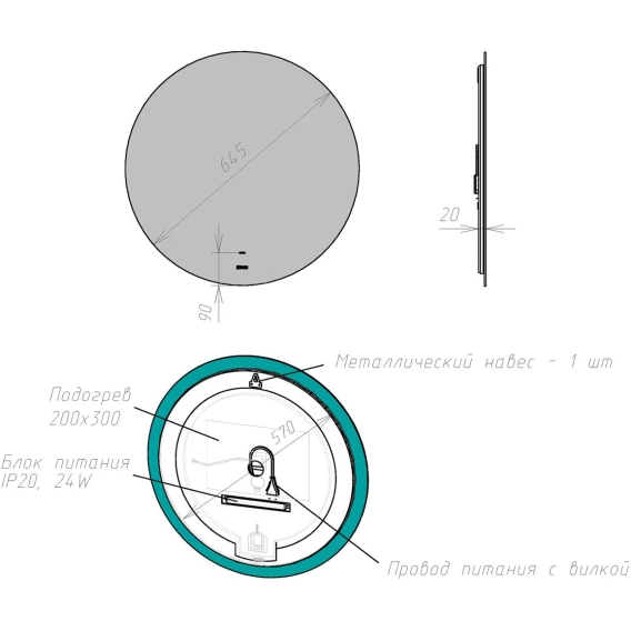 LED подсветка, Сенсорный выключатель, Функция анти-пар, Вилка