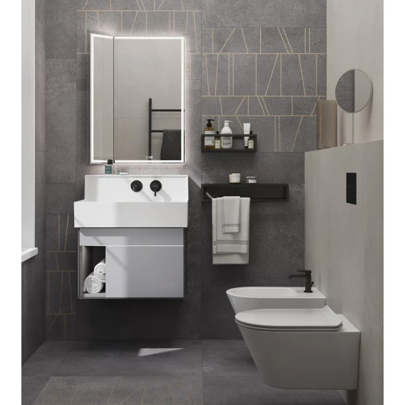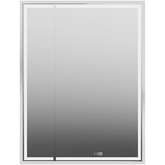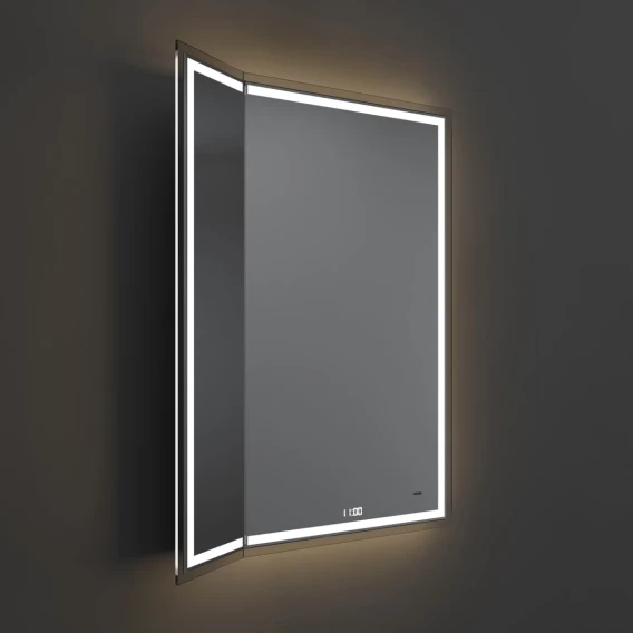 • У зеркала — бесконтактное включение и несколько режимов подсветки. Взмахом руки последовательно производится включение, переключение на необходимую теплоту (холодное, теплое, нейтральное свечение) и выключение зеркала.• С момента включения подсветки и до её отключения работает функция «антизапотевание».• На зеркальном полотне отображаются показания времени