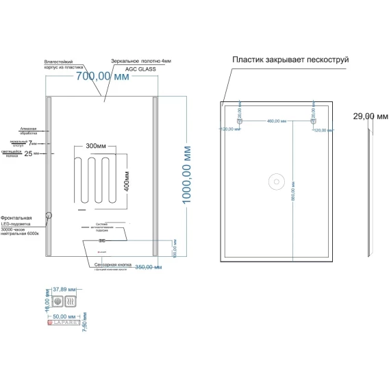 LED подсветка, Сенсорный выключатель, Функция анти-пар