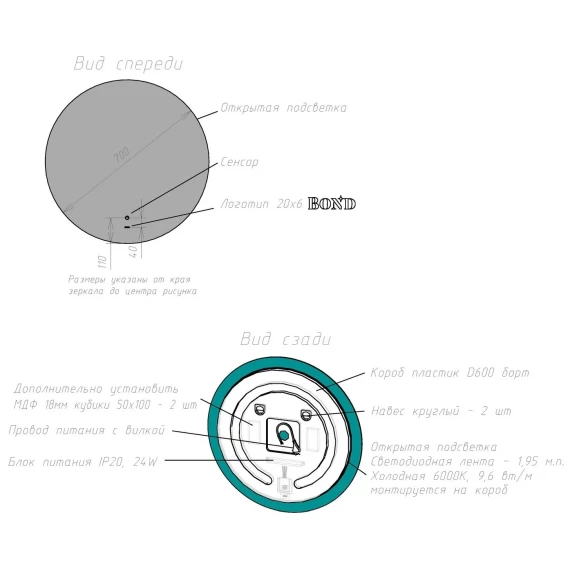 Крепление, LED подсветка, Сенсорный выключатель, Вилка