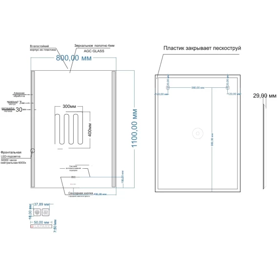 LED подсветка, Сенсорный выключатель, Функция анти-пар