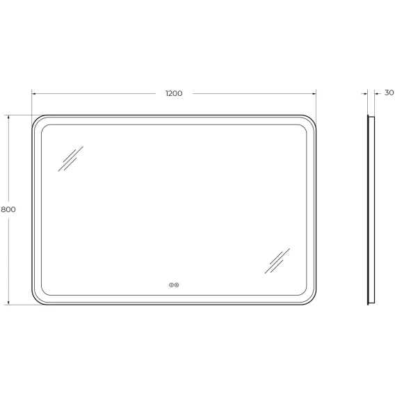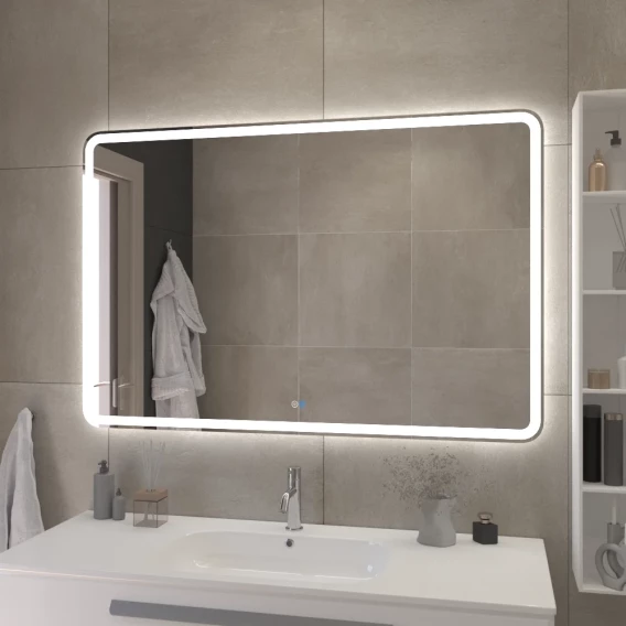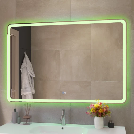Зеркало со встроенной подсветкой, двойным сенсорным выключателем с диммером. Лента 5050, 600 Led, 14,4 Вт на погонный метр, 4200 К, холодный белый свет в режиме - RGB 16 млн цветов. Сенсоры включаются (белая подсветка) и выключается (синяя подсветка) коротким нажатием(<1Сек). Нажатием первого сенсора регулируется яркость подсветки, при нажатии второго сенсора меняется цвет подсветки. Длинным нажатием сенсора можно отключить подсветку кнопки. Зеркало имеет функцию памяти, запоминает яркость и цвет подсветки.