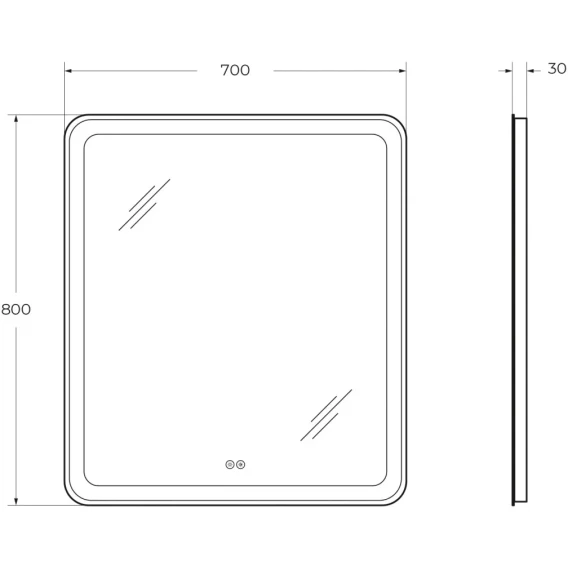 Зеркало со встроенной подсветкой, двойным сенсорным выключателем с диммером. Лента 5050, 600 Led, 14,4 Вт на погонный метр, 4200 К, холодный белый свет в режиме - RGB 16 млн цветов. Сенсоры включаются (белая подсветка) и выключается (синяя подсветка) коротким нажатием(<1Сек). Нажатием первого сенсора регулируется яркость подсветки, при нажатии второго сенсора меняется цвет подсветки. Длинным нажатием сенсора можно отключить подсветку кнопки. Зеркало имеет функцию памяти, запоминает яркость и цвет подсветки.