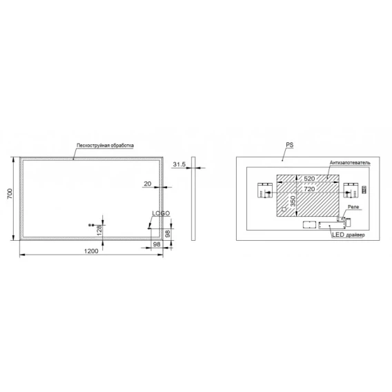 Крепление, LED подсветка, Сенсорный выключатель, Функция анти-пар