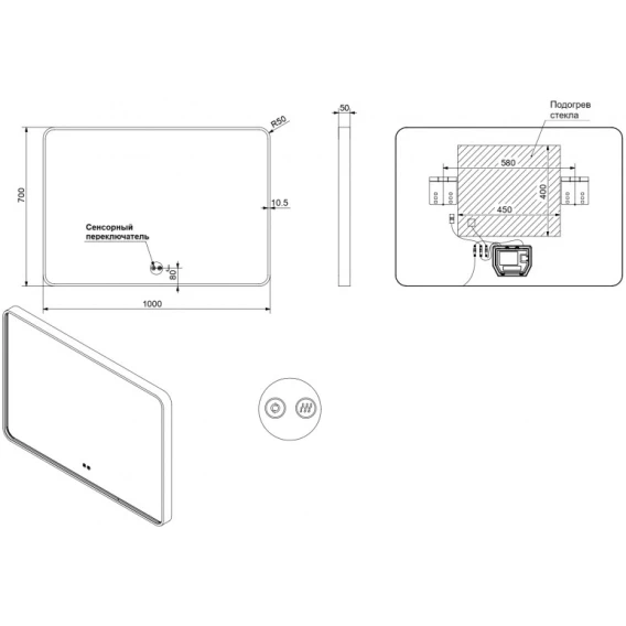 Крепление, LED подсветка, Сенсорный выключатель, Функция анти-пар