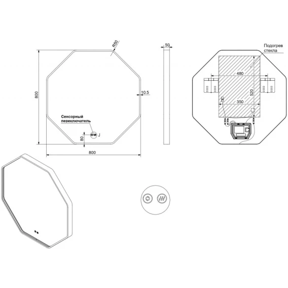 Крепление, LED подсветка, Сенсорный выключатель, Функция анти-пар