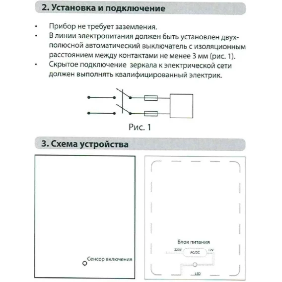 Крепление, LED подсветка, Сенсорный выключатель