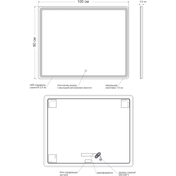 Зеркало Orange Nature ON-100ZE 100x80 см, с LED-подсветкой, сенсорным выключателем, диммером