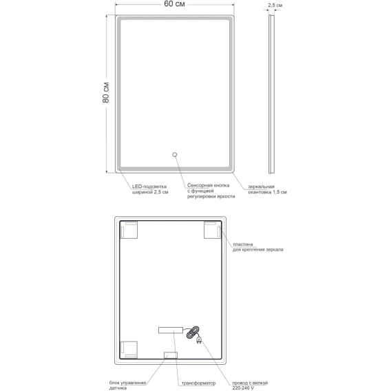 Крепление, LED подсветка, Сенсорный выключатель, Вилка