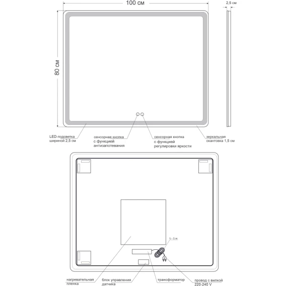 Крепление, LED подсветка, Сенсорный выключатель, Функция анти-пар, Вилка