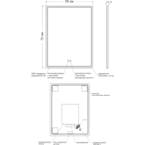 Крепление, LED подсветка, Сенсорный выключатель, Функция анти-пар, Вилка