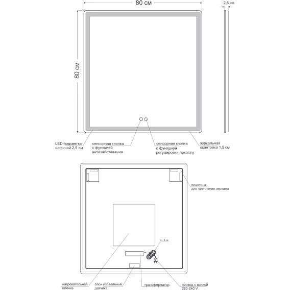 Крепление, LED подсветка, Сенсорный выключатель, Функция анти-пар, Вилка