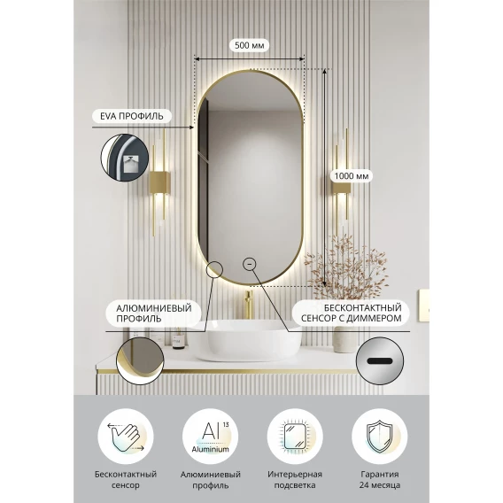 Зеркало Uperwood Next Premium ZNext50100g 50x100 см, с LED-подсветкой, сенсорным выключателем, диммером, золотой матовый